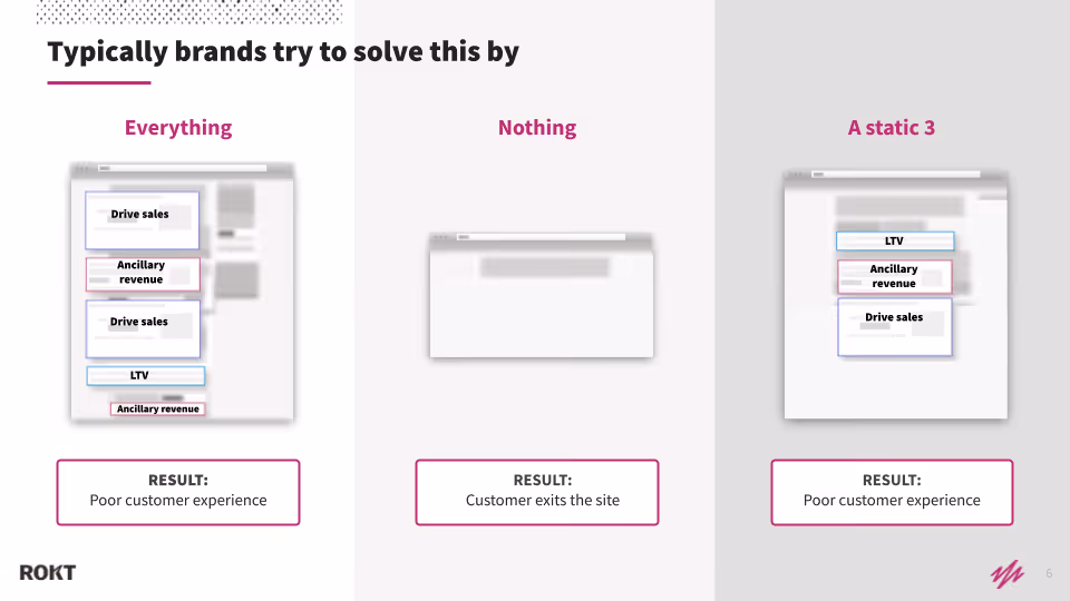 Most companies often use this real estate in 1 of 3 ways: they show nothing (which is a missed opportunity), they show everything (which overwhelms users), or they show 3 static options that are not personalized or relevant to the customer on the page.