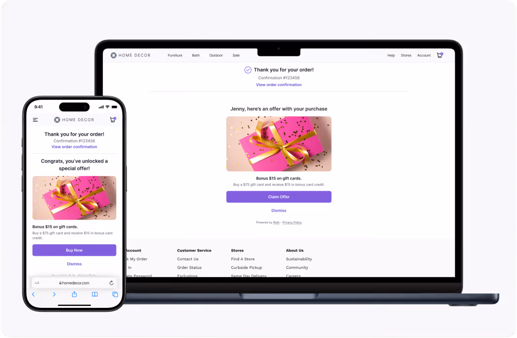 Post-purchase experience examples highlight how impactful this phase can be. For instance, brands might provide product tutorials or invite customers to join a loyalty program. With Rokt, the experience is elevated even further. Our platform optimizes the Transaction Moment by delivering hyper-relevant, real-time offers on the confirmation and thank you pages, such as complementary products, exclusive discounts, or third-party promotions. These offers enhance the customer’s experience while unlocking incremental revenue for your business.