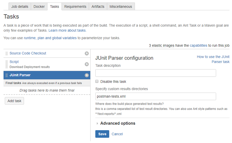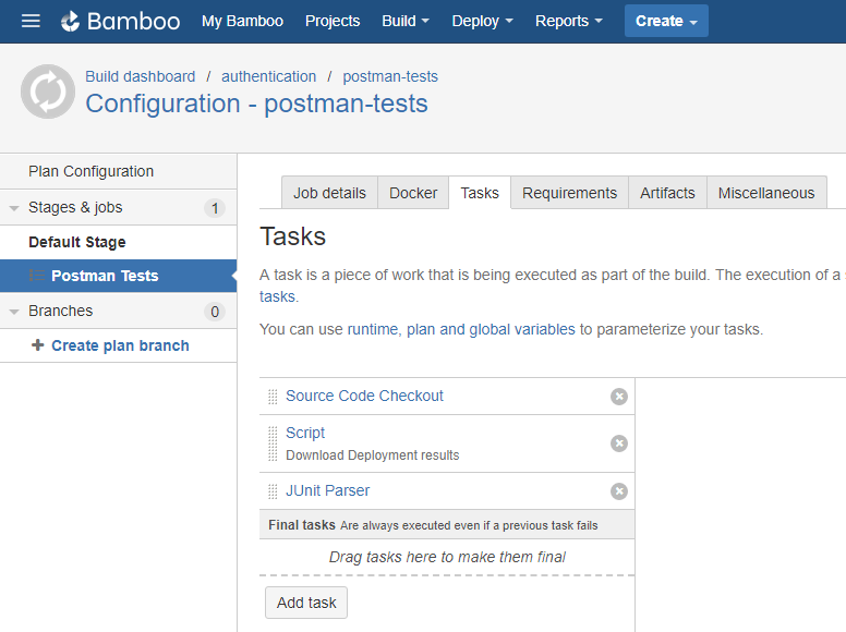 Wäre es angesichts dieser großartigen Testreihe für diese Endpunkte nicht schön, sie in den Bau- und Bereitstellungsprozess von Bamboo integrieren zu können? Insbesondere wäre es ziemlich cool, eine Postman-Sammlung gegen eine Bereitstellung auszuführen, um sicherzustellen, dass die Codeänderungen in der realen Welt funktionieren. Nun, es gibt einige schlechte und einige gute Nachrichten. Leider werden Postman-Integrationstests in Bamboo nicht nativ unterstützt, aber wo ein Wille ist, gibt es auch einen Weg. Dieser „Weg“ ist nicht gerade die eleganteste Art, Tests in Bamboo durchzuführen, aber er erreicht das Ziel: