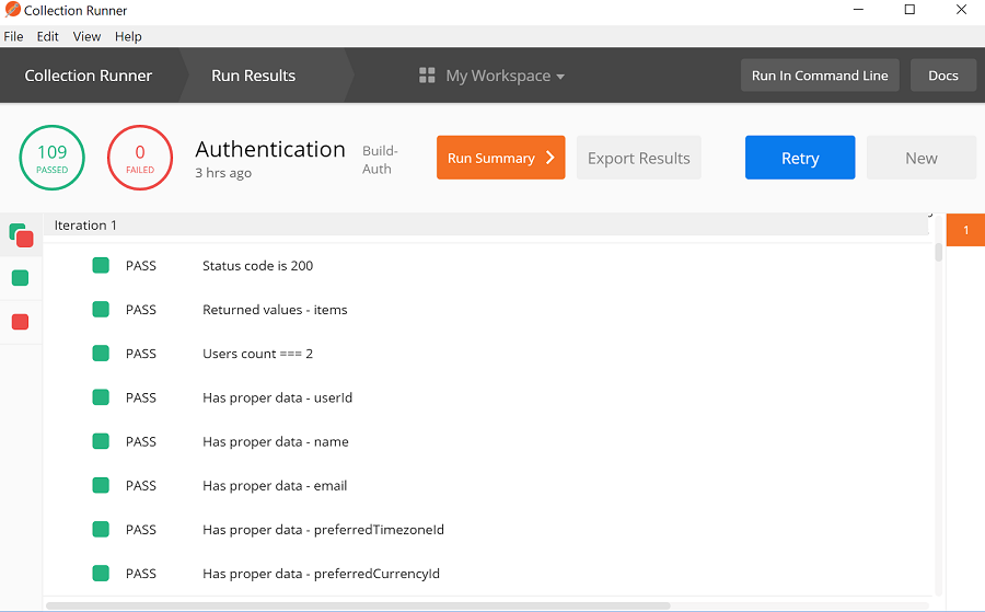 Wählen Sie hier die Sammlung und alle für diese Sammlung erstellten Umgebungen aus. Führen Sie als Nächstes die Sammlung aus. Wenn alles gut geht, zeigt ein grüner Kreis die Anzahl der bestandenen Tests an. Weiter unten im Fenster werden detaillierte Informationen zu einzelnen Tests und Anforderungen angezeigt, z. B. die Dauer jeder Anfrage und welche Assert-Anweisungen erfolgreich waren.
