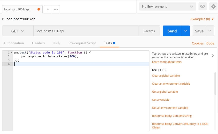Diese Anfrage ist überhaupt nicht komplex, sie ist sogar so einfach wie es nur geht, aber sie erfüllt ihre Aufgabe, mit dem lokal gehosteten Backend zu kommunizieren und eine Antwort zurückzugeben. Mit Postman können wir mit wenigen Codezeilen elegante Tests für unsere Endpunkte erstellen. Nehmen wir zum Beispiel an, wir möchten einen Test für den oben angegebenen Endpunkt erstellen und sicherstellen, dass alle an ihn gerichteten Anfragen einen 200 HTTP Statuscode. Alles was wir tun müssen, ist den Tab „Tests“ der Postman-Anfrage aufzurufen und mit dem Schreiben des Tests zu beginnen.