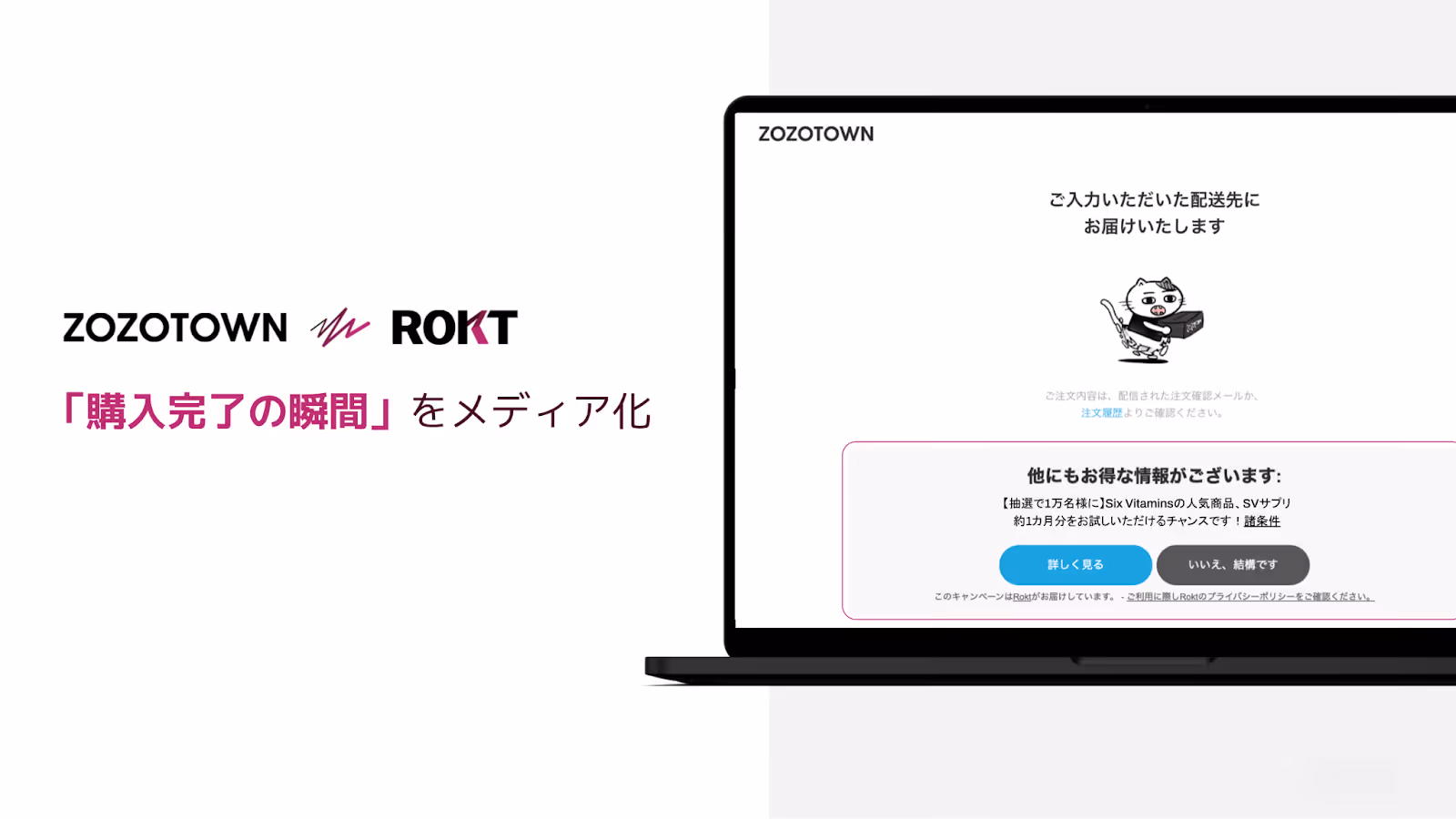 こうした課題へのアプローチとしてたどり着いたのが「購入の瞬間」というタイミングの活用だった。「サイト内の色々なタッチポイントの中でも、購入完了画面、サンクスページであれば、すでにお買い物を終えたあとに通るページなので一番お客様の購買行動を阻害しない。何かチャレンジできそうだなと模索していたところに、Roktというパートナーと出会い、このサンクスページへの外部広告を導入した。(山口氏)」