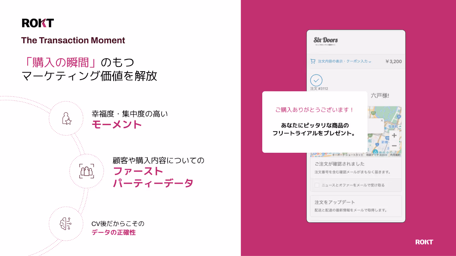 ECサイトのリテールメディア化は「Rokt Ecommerce(ロクト・イーコマース)」というソリューションを導入して実現した。ECにおける「購入の瞬間」は、顧客の会員情報や決済情報、購入した商品についての情報などさまざまなデータが得られる瞬間。こうしたファーストパーティデータを活用し、ユーザーにとって関連性の高い、外部広告主によるオファー(お得なキャンペーン情報など)を表示する「Rokt Ecommerce」の導入により、自社商品以外の価値ある情報を届けることに成功した。